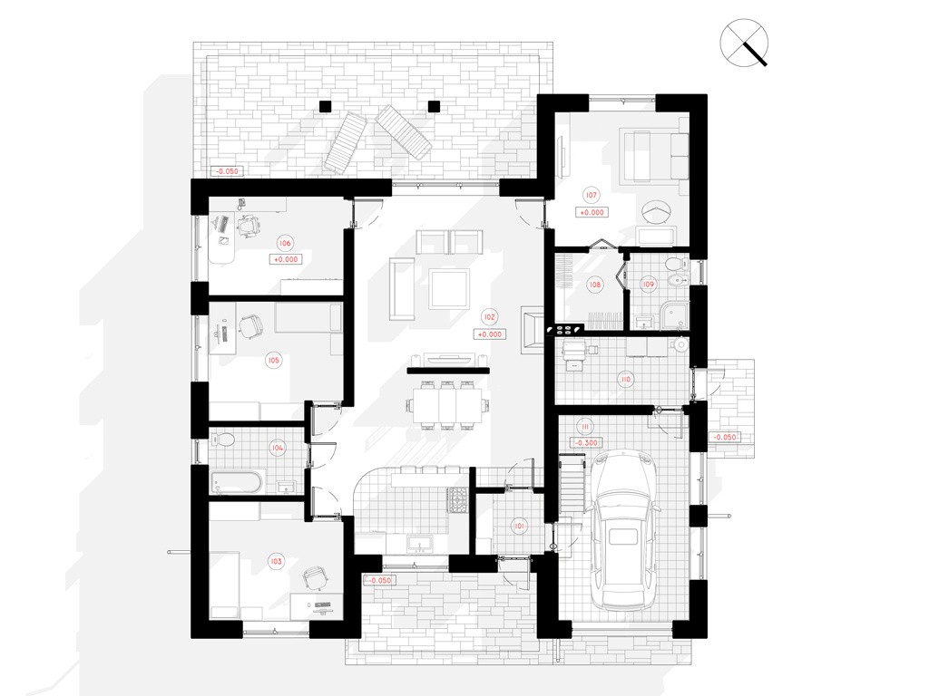 Other versions of this house plan according to your needs are possible by variously joining or splitting the spaces. We are sure that after hearing out your wishes, we would professionally advice you and together we would adopt the optimal decision, so that the house would be maximally adapted to the needs of your family.